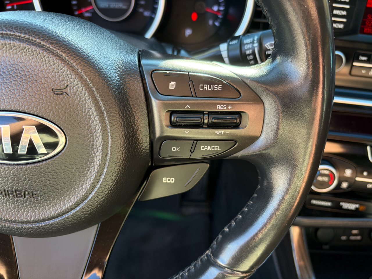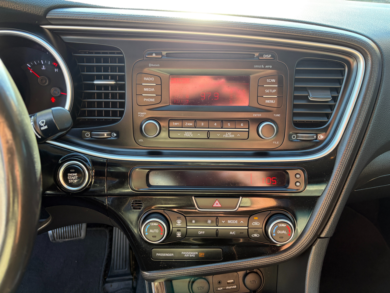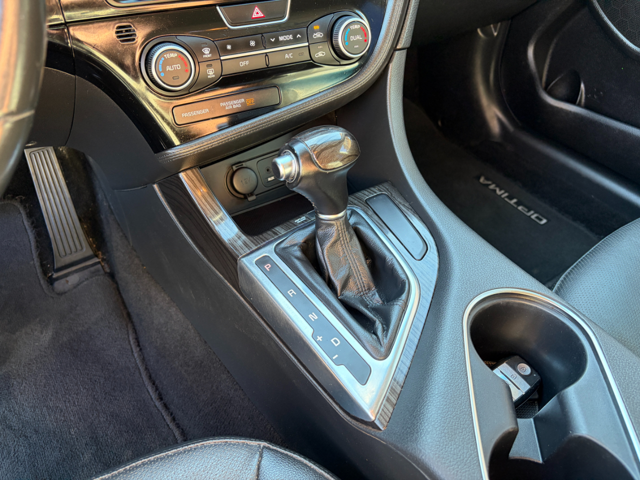 Take a peek inside to find a spacious and comfy interior with leather accents and modern technology. The dual-zone automatic air conditioning keeps you cool on hot days, while the 10-way power-adjustable driver's seat ensures maximum comfort on long drives. With features like cruise control, illuminated glove box, and front/rear cupholders, this Optima is designed to make your driving experience seamless and enjoyable.
